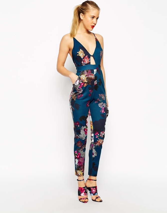 If you’re ready to take the next step and go all in on neoprene, this sleek floral jumpsuit is for you. (Matching mules are optional.)