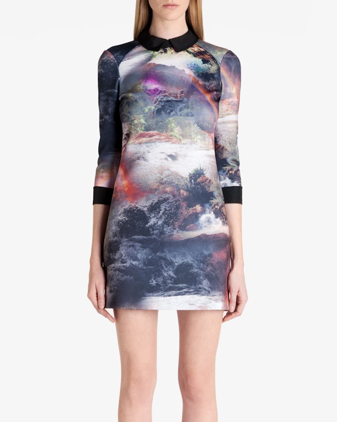 The pairing of this photorealistic, psychedelic pattern on a relatively conservatively cut collared dress is eye-catching, making the fabric almost an afterthought. But surprise — it’s neoprene.