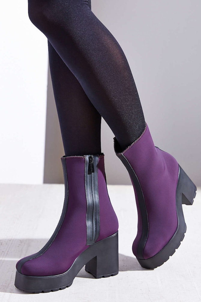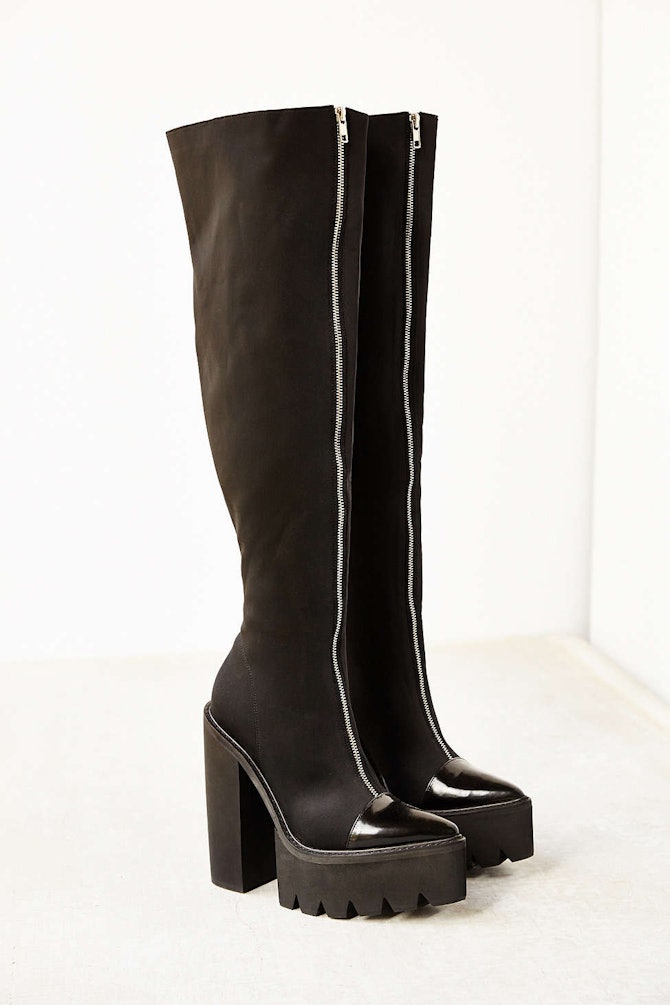 These knee-high 90s-style boots with a chunky heel are given a modern twist with neoprene. The patent leather toe is a perfect accent to offset the fabric.