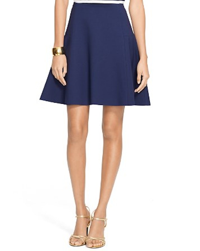 Using an unconventional fabric doesn’t mean the cut and color have to be unconventional, too, as proven by this flared skirt from Lauren Ralph Lauren in a muted navy.